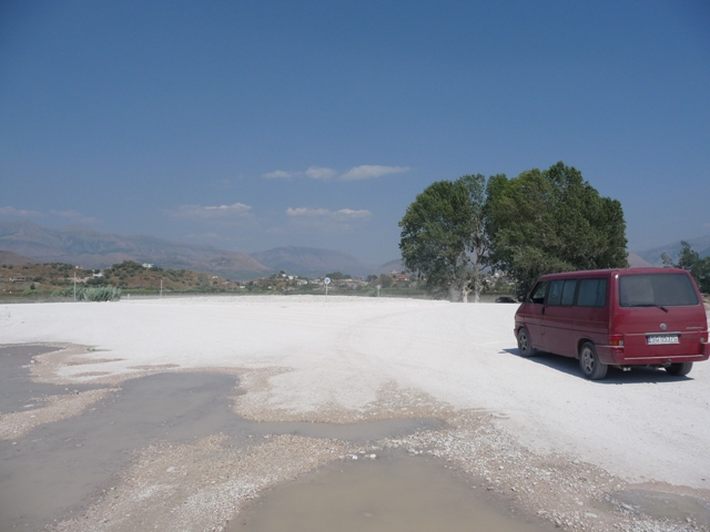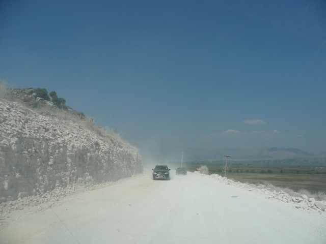 Wracamy w okolice Sarandy i bocznymi drogami przez góry jedziemy na przejście graniczne z Grecją. Okolice remontowanych dróg wyglądają zimowo, jakby przyprószone szadzią.