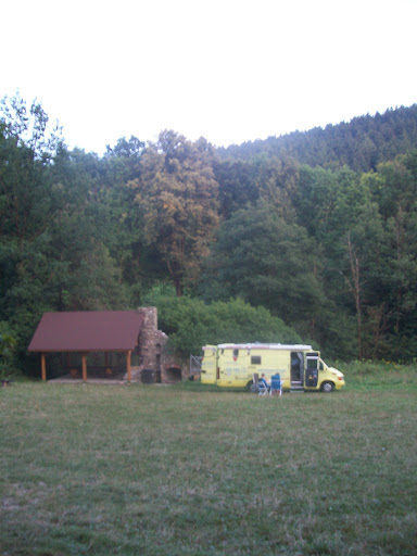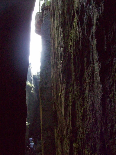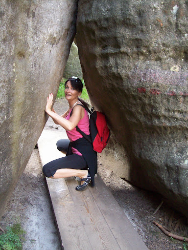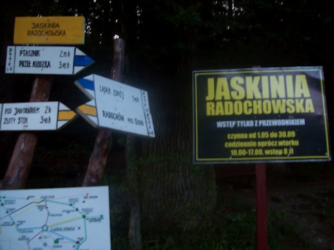 Krążymy , wypatrujemy i lądujemy w środku lasu na polance przy wejściu do mało znanej jaskini radochowskiej …. Ni żywej duszy , cisza i spokój (N 50 21 30 74 E 16 49 04 98 ) . Na tablicy informacja , że przewodnik pojawi się może o 10 rano o ile się pojawi . My tu tylko na noc , więc nie będzie nam gość potrzebny . Rano przy śniadaniu coś zaczyna kropić i to jest pierwszy deszczyk jaki nas spotkał w trakcie wyjazdu …pierwszy raz też rozwijam część markizy , dalej jednak gorąco i po chwili też sucho , deszczyk jak przybiegł tak pobiegł .