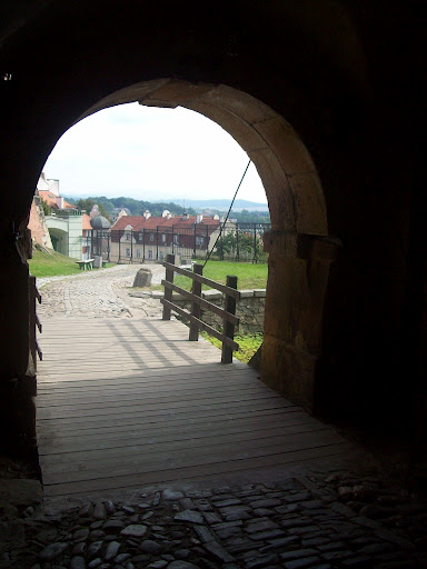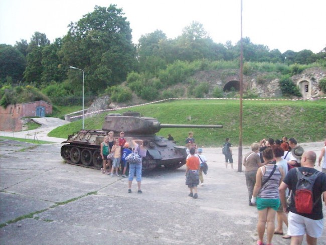 Na powierzchnię wychodzimy niedaleko od wejścia , na tyłach kościoła …. Szału nie ma . Idziemy do twierdzy , wejście z przewodnikiem i opowiadania nie ma końca . Ogólnie znowu czyjeś ambicje połączone z krzywdą wielu żołnierzy powołanych na siłę do armii . Twierdza była miastem w mieście a trzeba powiedzieć , że obiekt potężny . Czego czas nie rozwalił to popsuli najemcy , dzierżawcy , nawet jakiś browar tam robił coś na kształt piwa czy taniego wina …. Unia trochę kasy wpompowała to udało się coś ocalić od zapomnienia . Każda wycieczka jest zapraszana do Sali multimedialnej gdzie jest karmiona przydługawym filmikiem ukazującym odbywające się w okolicy rekonstrukcje sławniejszych bitew i starć wojsk ….. tacy tam przebierańcy z komórką na pasku i mercedesami w oddali , strzały z armat by dymu narobić ….. lekko się naziewałem , pewnie przez upał i tradycyjnie z głodu . Zwiedzanie twierdzy dla rodzinki to jakieś 60 zł i oczywiście drożej niż w necie bo komu by się chciało aktualizować cennik raz na rok . Tam też kręcili ostatni odcinek „Czterej pancernych” , rudy nie zmieścił się przez bramę , więc został na dole a Janek ( wg słów miłej przewodniczki przyozdobionej w gruby mundur , pewnie dla ochłody przed zimnem ) tak długo biegł pod górkę że aż dwa razy przebiegł jedną bramą z charakterystycznym napisem …. Ot magia filmu i nieuważnych widzów , jak widać nie wszystkich.