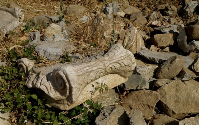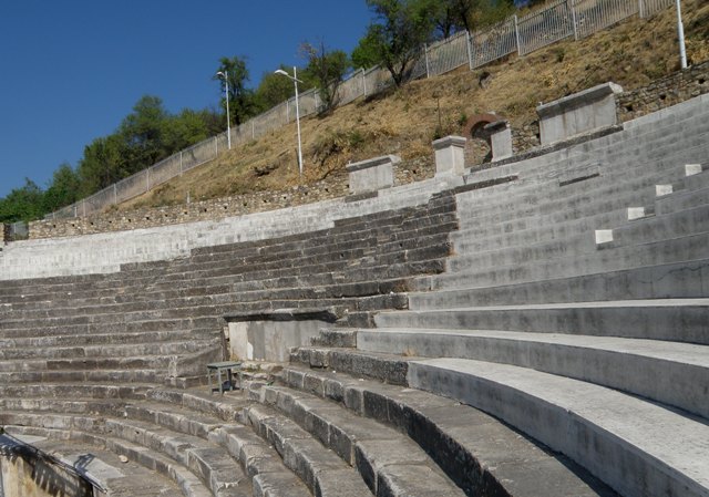 Amfiteatr na stoku wzniesienia, został wybudowany za czasów panowania Rzymian. Odbywały się tutaj walki gladiatorów z dzikimi zwierzętami. Wchodzę na najwyższy stopień i podziwiam okolicę. Niedaleko, po prawo, grupa archeologów w promieniach piekącego słońca, z pietyzmem przeszukuje ziemię. Wszędzie leżą elementy antycznych budowli, a w niewielkim muzeum są rzeźby bóstw, naczynia gliniane i inne narzędzia, znalezione podczas prac wykopaliskowych.