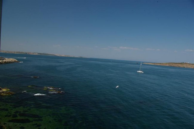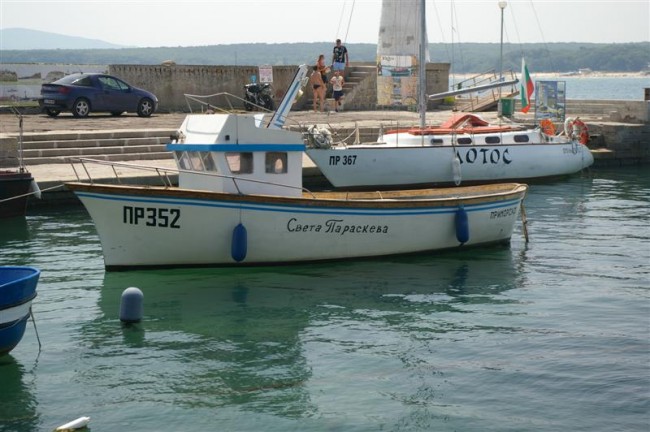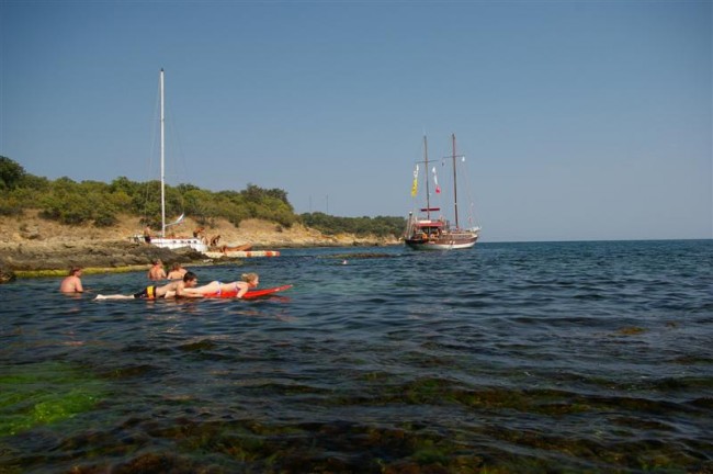 Po wyprawie do Sozopola postanawiamy troszkę odpocząć od skwaru, który panuje w wąskich uliczkach miasta. Kierujemy się do maleńkiego portu w Primorsku i tam za niewielką odpłatnością mustrujemy się na dwumasztowy, drewniany żaglowiec. Niestety ze względu na duże braki kadrowe żaglowiec ten płynie na silniku a nie na żaglach. Szkoda, ale i tak się wszystkim podoba mimo dużej fali (tak na oko 1,5 metra). Za pomocą tego środka transportu dopływamy do uroczej laguny do której jest tylko dostęp od strony morza.