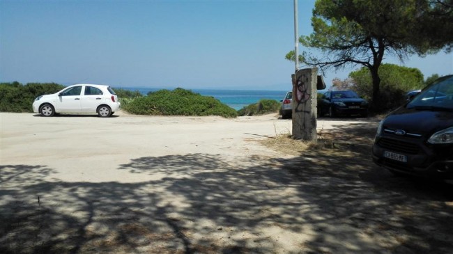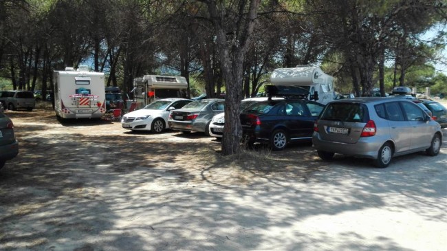 | Uciekliśmy bardziej południe Sitonii. Po drodze zajechaliśmy na Orange Beach. Zjazd z głównej drogi kiepski, stromy i do tego piaszczyste klepisko. Nie dojechaliśmy do samej plaży. Wysłaliśmy tylko kobiety jako reprezentantki. Wróciły bez ochów i achów więc postanowiliśmy (mimo iż zobaczyliśmy rozłożonego kampera) pojechać dalej. Dojechaliśmy do Sarti. Na wjeździe do miejscowości jest wjazd do portu i na teren zaniedbanego opuszczonego kampingu. Woda dość czysta lecz towarzystwo nas odstraszyło. Pojechaliśmy dalej i za Sarti zjechaliśmy na Platania Beach. Stoi tu kilka kamperków (Bułgarzy, Francuz, Szwajcarzy, Niemiec i jeden nasz rodak. Miejsce wygląda nieźle więc postanowiliśmy zostać na noc. Plusy tej miejscówki to widok bezpośrednio na morze i brak prawie zupełnie os - co na południu Europy jest rzadkością (zapomniałem przy poprzedniej miejscówce dopisać że ilość fruwających os przekroczyła jakąkolwiek granicę przyzwoitości). Niestety minusem jest wataha psów (momentami chyba 7) biegających po plaży. Na szczęście nie są agresywne. Wieczorne grillowanie suvlaków i spijanie imieninowych płynów minęło w miłej atmosferze. |