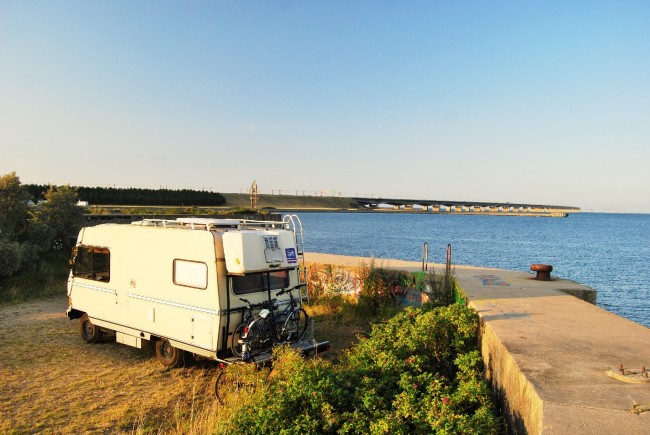 Jedziemy na Zelandię. Po drodze spacer w Nyborg i nocleg w starej przystani promowej (działała przed powstaniem mostu): 55.295035, 10.845515