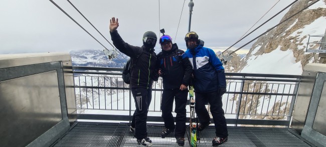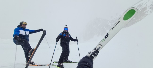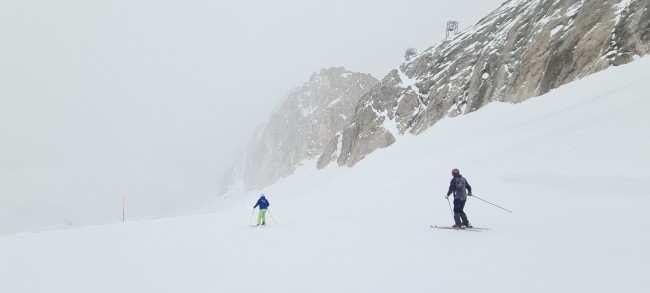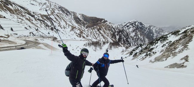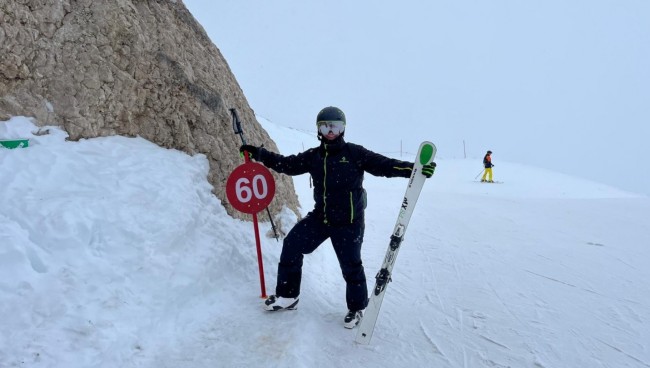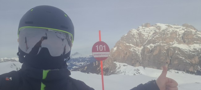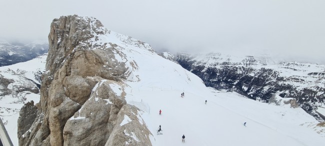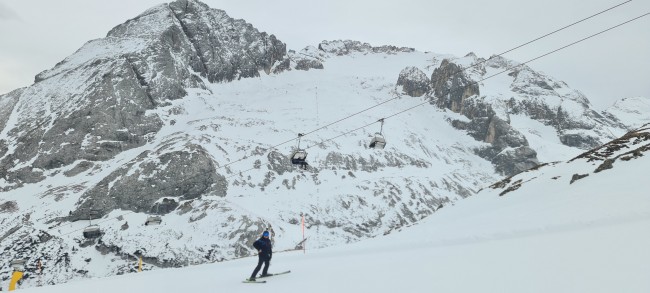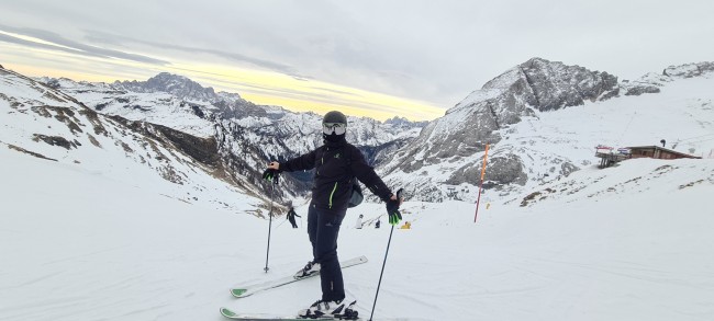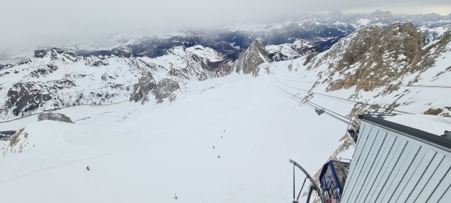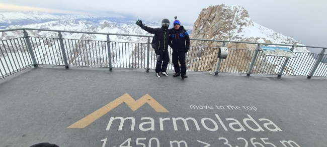 Wybraliśmy się z naszego miejsca kamperowego (Corvara-Pralongia) na Marmoladę na nartach. Marmolada to najwyższy szczyt Dolomitów wiec przyciąga zimą narciarzy którzy chcą zjechać z jego lodowca. Trasa z wierzchołka ma 5,5km długości i często jest oblodzona lub pokryta wielkimi muldami. Mieliśmy szczęście bo nie było ani jednego ani drugiego feleru. Był trzeci brak słońca, mgła i lekki opad śniegu