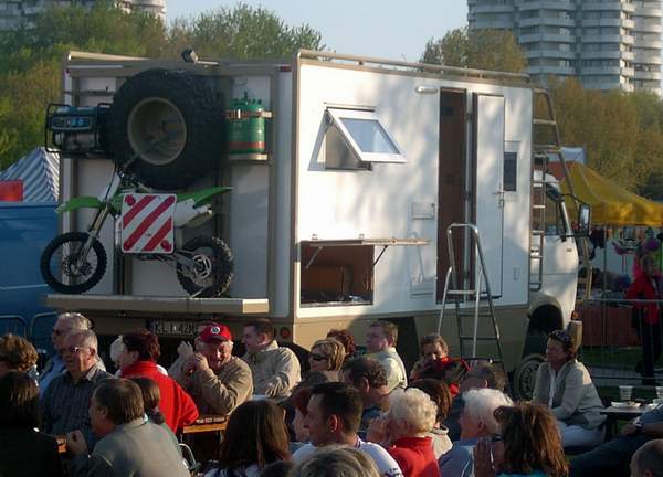 też spodobało mi się to dwa w jednym , można powiedzieć ruchomy garaż ale bardzo ciekawy był kamper terenowy w środku wykonane wszystko z pełnego drzewa nie z płyt > super na ryby można by prawie na środek jeziora wjechać i sobie połowić, motorek na nim też niczego sobie, zastanawia mnie tylko ta butla z gazem zamocowana na zewnątrz hmm czy to bezpieczne ?? a jak odpadnie albo komuś się spodoba