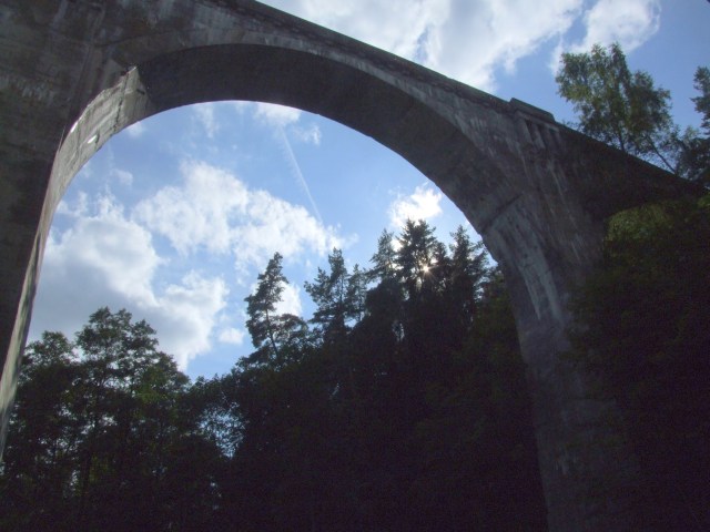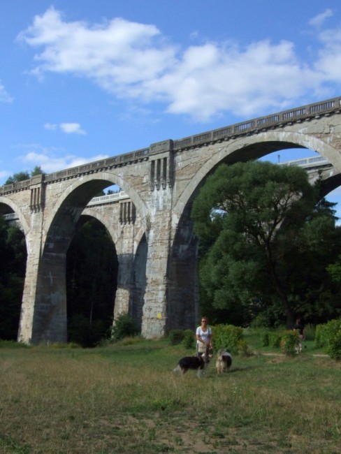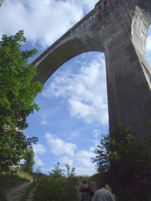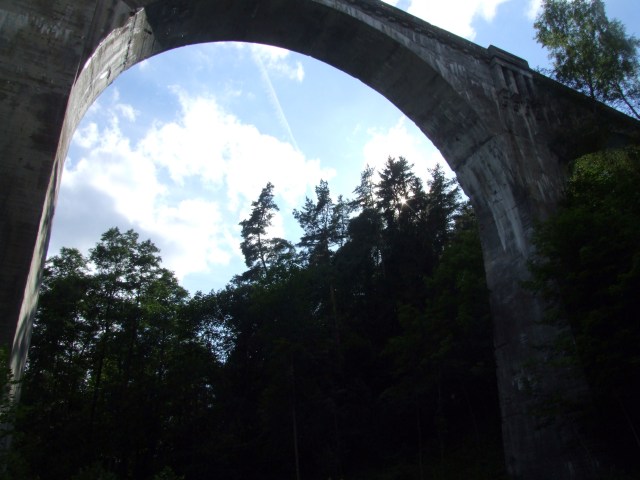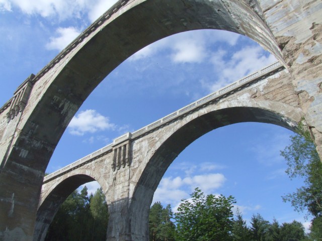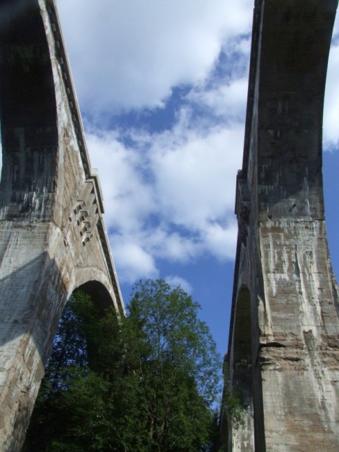 | Cytat: | Dwa równoległe wiadukty, każdy długi na ponad dwieście metrów i wysoki na prawie czterdzieści (*), spinają strome w tym miejscu brzegi Błędzianki. Nawet najwyższe świerki swymi ostrymi czubami nie sięgają koron wiaduktów.