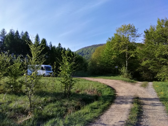 08.05. Nocleg na leśnym parkingu, przy szlaku do źródła św. Jana z Dukli, obok wsi Jasionka, 49.541157, 21.714172.