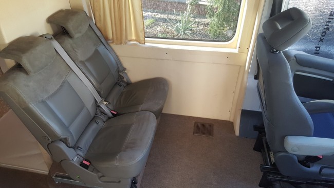 A jak ktoś potrzebuje nieokazjonalnego miejsca do spania to za pomocą tych foteli też można to zrobić - ustawione w kierunku jazdy ze złożonym oparciem są idealnie płaskie do tego regulowany stolik pod ich wysokość oraz przedni fotel z regulacją wysokości i mamy płaską powierzchnię. Tyle że trzeba wtedy wozić ze sobą dodatkowy materac. |