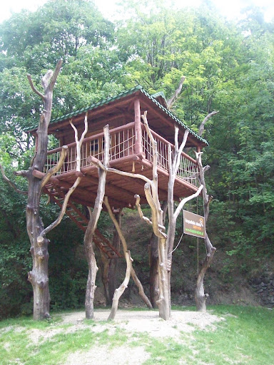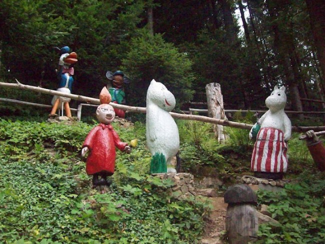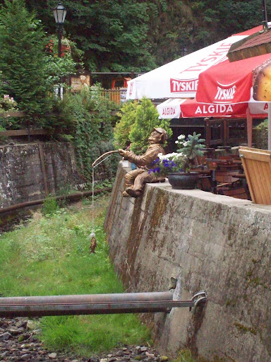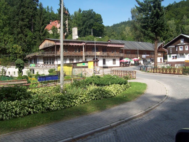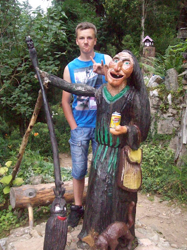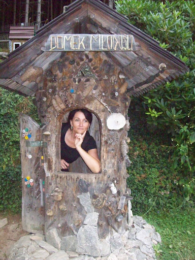 Po upalnych chwilach we wnętrzu huty nasz szlak prowadzi do Międzygórza gdzie to sławny wodospad „Wilczki” wstrzymuje oddech na nasz przyjazd . Wioska pusta ale to normalne … do wodospadu droga łatwa , spacerek wręcz …oglądamy jak woda spada , podobno to jakieś tam wyjątkowe ale nie wierzę w te opowieści … nad wodospadem , gdzieś tam w górze jest „ogród bajek „ …. Mówię sobie niech będzie ale droga zaczyna się od ponad 300 schodów …. Nie jest już dobrze … potem dalej wspinaczka i dochodzimy . Dzieci zachwycone ale …nie nasze , nawet nie trochę mniejsze ….. tylko te małe , których rodzice donieśli na rękach . Nasze są zachwycone dopiero jak robimy z siebie osiołki wchodząc do różnych domków by strzelić fotola …. Z jednej strony się nabijają ale z drugiej oglądają za siebie by ktoś nie widział …obciach przecież przed światem jak rodzice się bawią . Schodzimy inną drogą , razem to z 5 km po górkach mamy dziś nachodzone … nogi bolą , znowu wszyscy głodni , więc lądujemy w miejscowej knajpce żywcem wyjętej z jakiejś reklamy w Trybunie Ludu . w Złotym Rogu zjesz ale szału nie ma ....