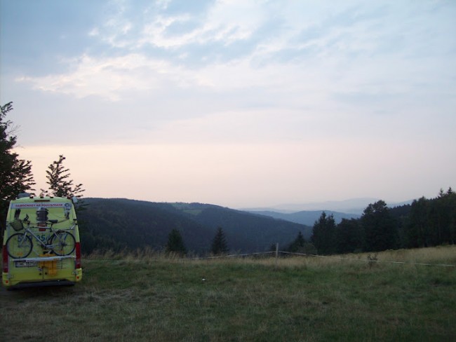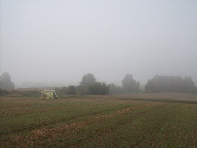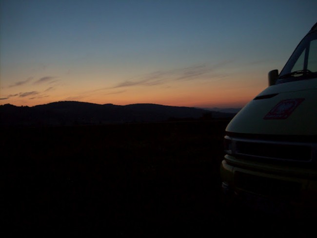 Jedziemy szukać miejscówki ale wspinamy się najpierw na 913 m obok wyciągów na Śnieżnik , tak wysoko to nie bylismy autem , które często na II biegu i pierwszy raz w dziejach załączył się elektromagnez na wiatraku chłodnicy ... dziś noc bez wody w strumieniu , na świeżo skoszonym polu daleko od asfaltów … super klimacik tak wieczorem jak i rano …