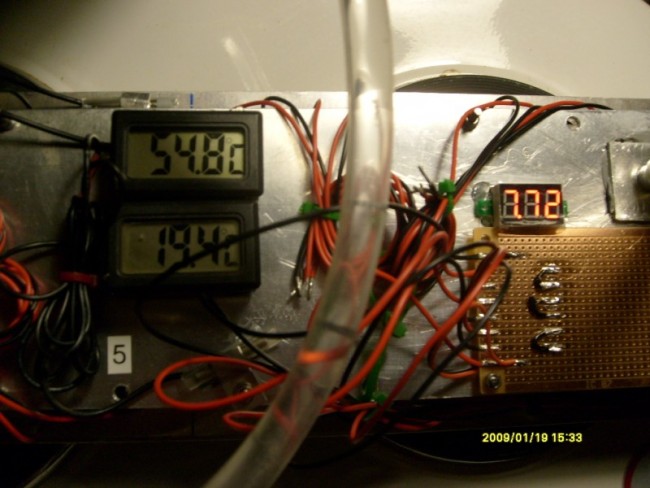 Kilka zdjec. Z 18 TEG-uw zostawilem 8 i polaczylem 1+1 x 4. Te osiem dawalo ponad 20 Volt w szeregu. Te 10 wyjetych powolodowalo straszne spiecie termiczne. Teraz 8 daje pravie 5 Watt. Ale tylko jesli temp. jest 90C. Tego ni jak nie osiagne w Trumie. Planuje zmiane cieplej plyty na wieksza i zamontuje zeberka. Oczywiscie bardzo kusi aby przerobic czesc Trumy na wode. No ale wazne ze to zaczyna dialac.