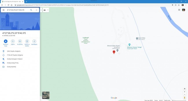 | Barbara i Zbigniew Muzyk napisał/a: | | uhuprzem napisał/a: | | dojazd do Bułgarii, gorące źródła (41°27'28.2"N 23°15'42.3"E) | szukakm ale gogle mapy nie mogą tego znaleźć,jak się to miejsce nazywa,albo podpowiedz jak znaleźć na mapie |