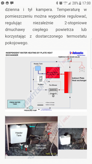 | xbartman napisał/a: | | TU pod koniec masz krótki opis i zdjęcie wymiennika. Włączyłem się w oryginalną instalację webasto (eberspacher) samochodu, równolegle do nagrzewnicy przestrzeni mieszkalnej. Przewody takie same jak oryginał doszły tylko trójniki zawór i dodatkowa pompka. I oczywiście kilka przekaźników do sterowania. Robota prosta na kilka godzinek pracy. |