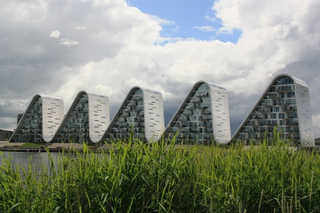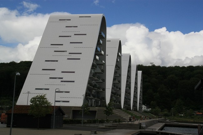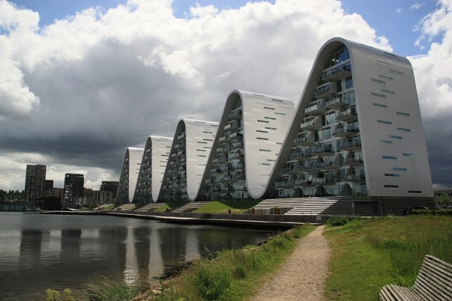 Fala w Vejle - Ekskluzywny i charakterystyczny budynek mieszkalny składa się z pięciu pofałdowanych fasad wyłożonych płytkami. Każda fala ma dziewięć pięter i składa się z 20 różnych rezydencji.