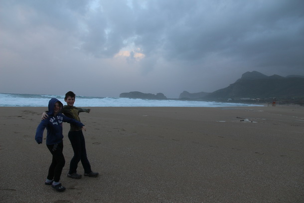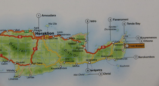 Wybierajac się do Grecji zabraliśmy nasze deski, zagle i kity. Nie za bardzo wiedzieliśmy co nas oczekuje na Krecie. W książce, która mielismy : „The Kite and Windsurfing guide”, napisano, ze na Krecie nie ma zbyt wiele miejsc do kitowania, jest to raczej rewir dla windsurferow i to już zaawansowanych, gdybyśmy mieli ująć sprawę ogólnikowo. My natomiast wychodzimy z zalozenia, ze tam gdzie trochę wody i wiatr o odpowiedniej sile i kierunku zawsze można poplywac. Zobaczymy tylko czy na desce czy na kite? Z kitem jest trochę skomplikowanie, bo trzeba go wystartować a nie zawsze jest miejsce (linki ponad 25 metrowe) a i wybrzeże zazwyczaj skaliste. Windsurfing nie wszedzie mozna i chce sie dzwigac. To moze byc pewna trudnoscia w np. stromym miejscu. To co dla windsurferow jest trudnoscia okazuje sie zabawa dla kitowcow!