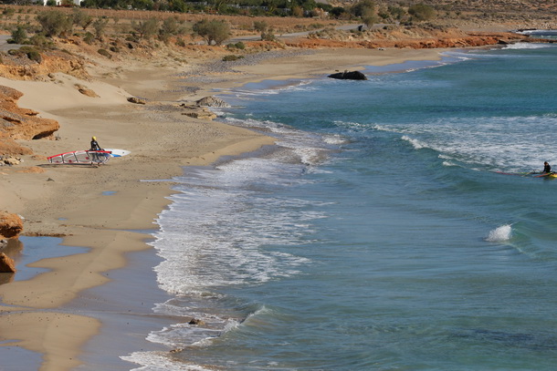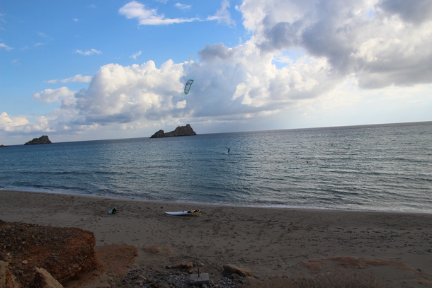Jeszcze kawalek dalej na południe jadac wzdłuż wybrzeża, dojedziemy do malej miejscowości o nazwie Aghia Irini. Zaparkowac musimy wyżej a sprzet znieść na dol. Plaza jest dość waska ale piaszczysta i możemy wystartować kite. Podczas mocno wiejących wiatrow, jest kłopot z ukryciem samochodu i spokojnego spania. Na plazy znajdziemy prysznice z woda. Tak jak już pisałam wcześniej w opisach wyprawy kłopot jest tez z zaopatrzeniem, trzeba jechać kilka kilometrow do Kato Zakros po chleb lub inne produkty. O tej porze roku trzeba się zaopatrzyć we wszystko i zamrozić chleb.