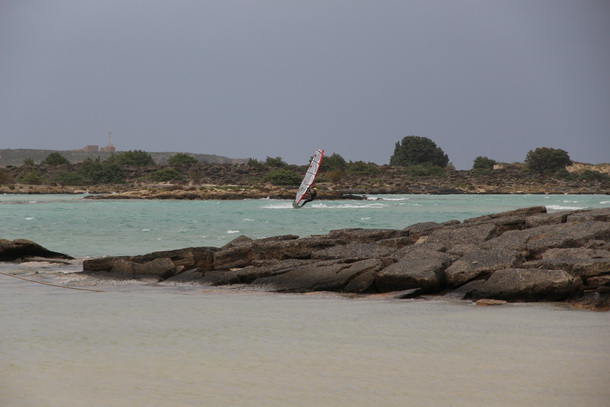 Paleochora to ciekawe miejsce dla windsurferow, ktorzy juz cos potrafia. Dojazd jest dosc uciazliwy bo mabrzezem nie mozna tu dojechac. To znaczy w ramach scislosci Grecy to robia ale maja o wiele mniejsze auta a i VW busik wybral droge w glab ladu i potem zjazd w dol. Takze kiepsko jest sie gdzies dostac, trzeba wjechac w glab ladu by potem zjechac znowu do wody. Warunki latem. wieje dosc silne Meltemi co powoduje, ze piasek odrywa sie od plazy i wiruje omiatajac ewentualnych plazowiczow. Nie jest to ulubione miejsce tych ktorzy zazywaja kapieli slonecznych, raczej omijaja to miejsce dalekim kolem. Natomiast zima wieja tutaj wiatry skosnie odladowe a przy kierunku W potrafia budowac sie ogromne fale. Wyjscie jak najbardziej z kierunku N.
