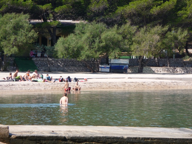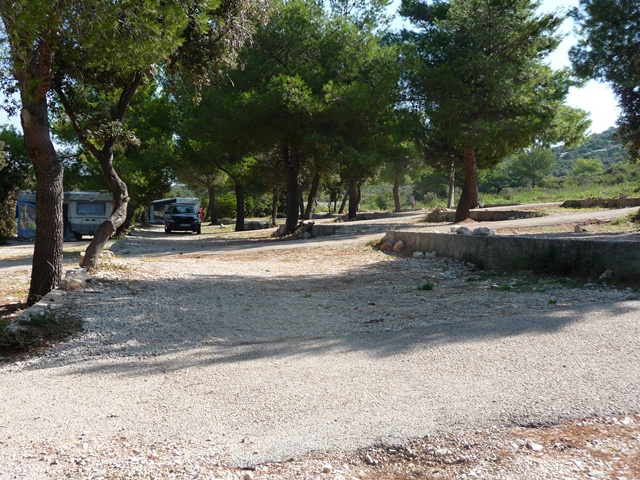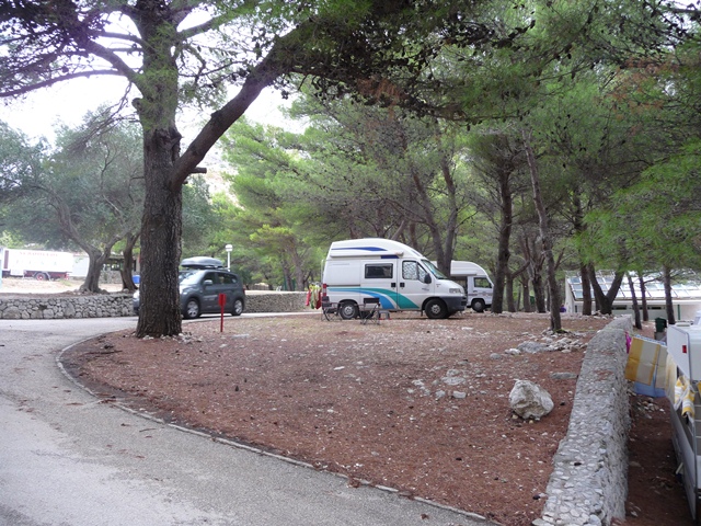 Camping Dole - teren dość spory – pewnie dlatego podczas ostatniej podróży po Chorwacji go minęliśmy. Parcele pod drzewami na kilku poziomach – te przy morzu znacznie droższe, ale plaża całkiem fajna, jest sklepik. Sanitariatów sporo, ale przydało by się im odświeżenie (w tle na zdjęciu) Obsługa miła – cena za zestaw po sezonie 90 kun. Za towarzyszy mieliśmy Austriaków w Svenie, ale rano minęło nas zdala kilka wyjeżdżających camperów na polskich rejestracjach – nikt nie zamachał
