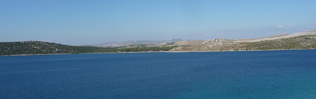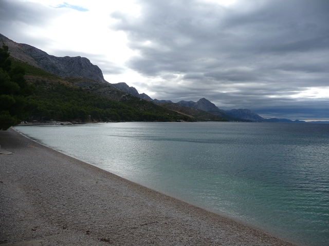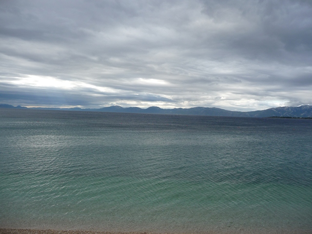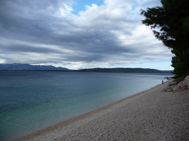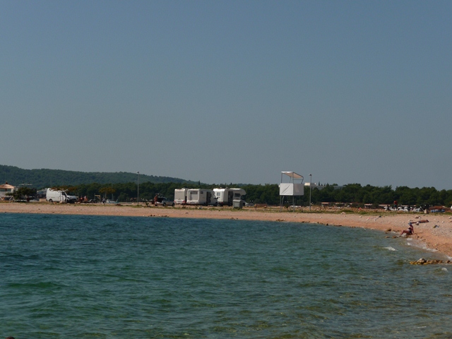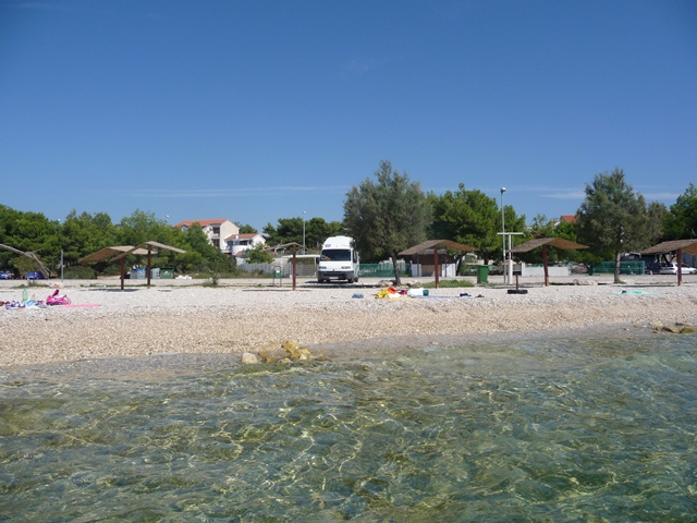 Wyjeżdżamy i od razu humory nam się poprawiają. Przede wszystkim przestało już wiać, robi się coraz cieplej. Jedziemy wzdłuż wybrzeża w poszukiwaniu jakiejś fajnej plaży. Mijamy Sibenik (opisany wcześniej) i z drogi rzucają nam się w oczy campery stojące przy plaży – długo nie trzeba było nas namawiać – skręt w prawo i już stoimy ulokowani przy plaży (43.41 601, 15.54 176). Ludzi na plaży brak – no może poza paroma Polakami z pobliskich kwater. Słoneczko grzeje już na tyle, że zaciskając zęby można chwilę posiedzieć w wodzie (jest prysznic) – ale na plaży w jego promieniach jest całkiem przyjemne
