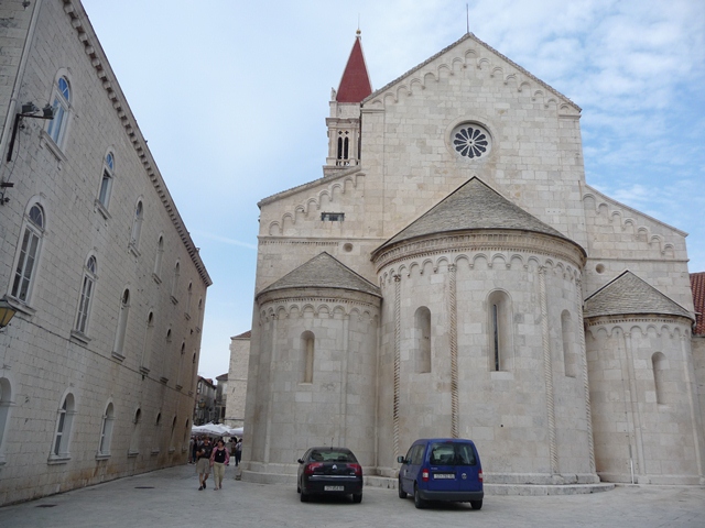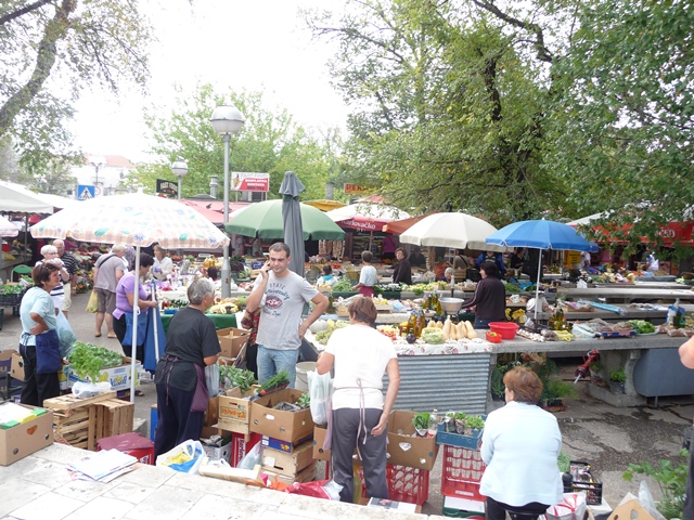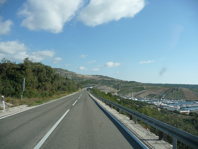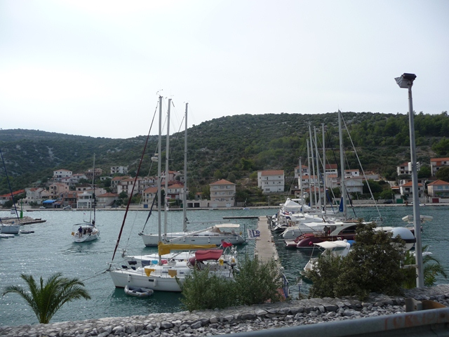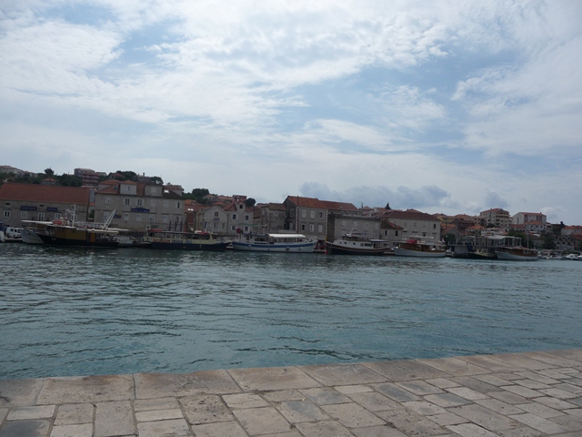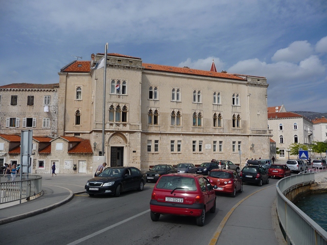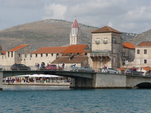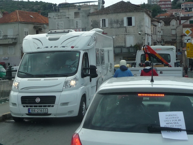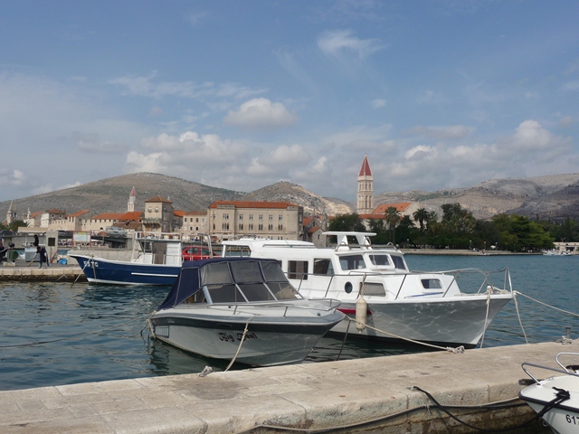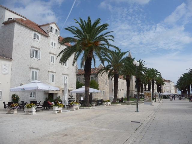Na sam camping lepiej zjechać z głównej drogi na końcu miejscowości tam gdzie jest znak, gdyż wzdłuż nabrzeża może okazać się miejscami, że dla wysokiego campera są tutaj za nisko gałęzie. Po pożegnaniu z właścicielką jedziemy dalej. Mijamy jakieś portowe miasteczko i wjeżdżamy do Trogiru. Przejeżdżamy wyspę, na której znajduje się starówka i za kolejnym mostem na Ciovo skręcamy w lewo by po 500m przystanąć na nabrzeżu. W mieście trwa normalne życie – wita nas targ, - zwykły codzienny dzień w środku września.