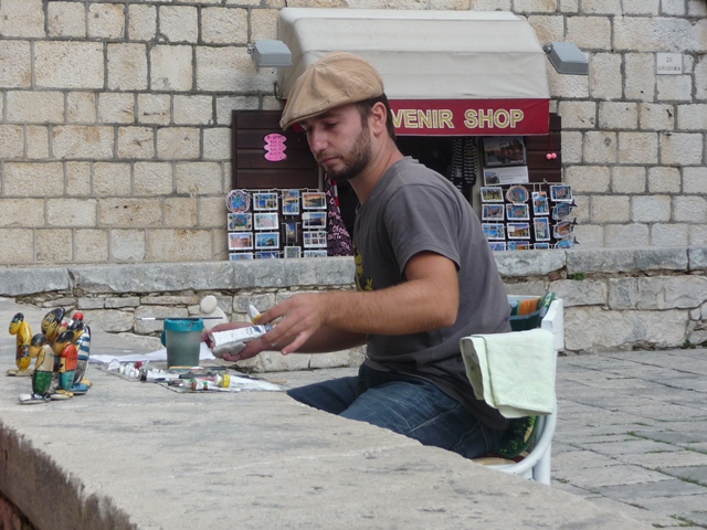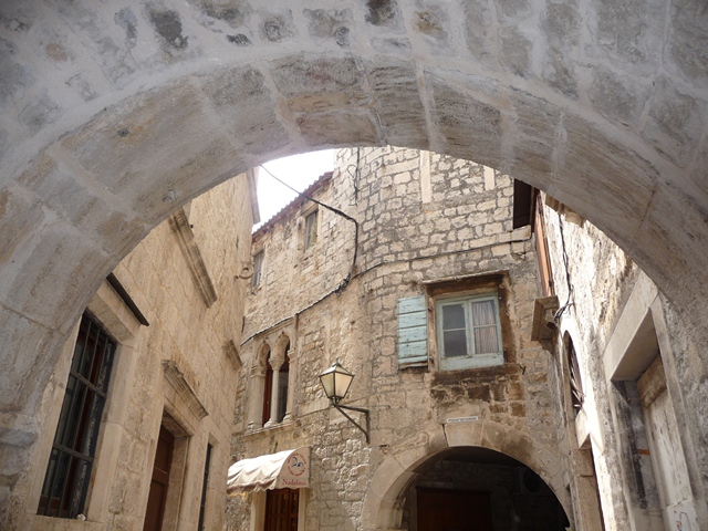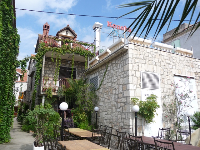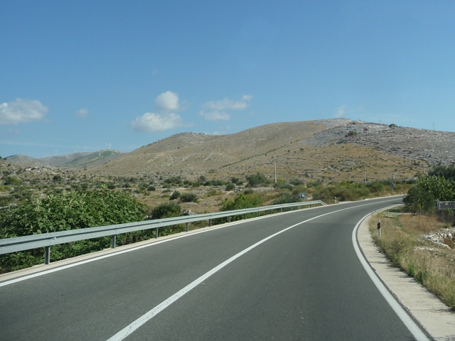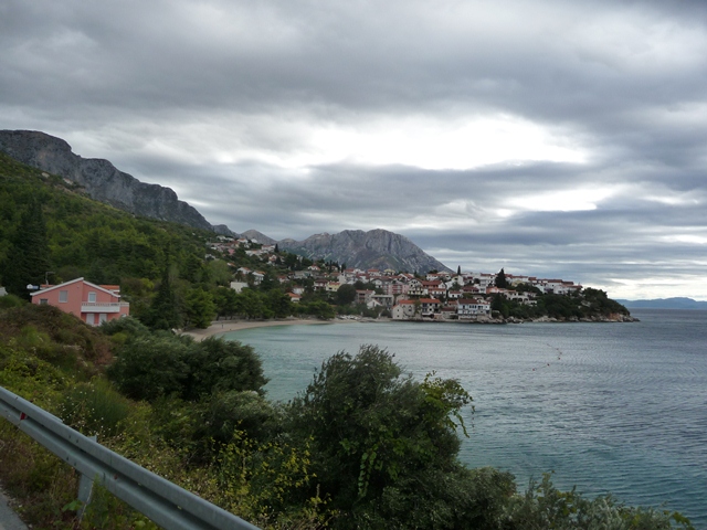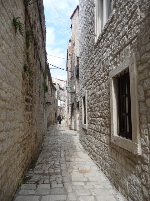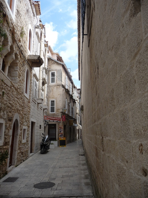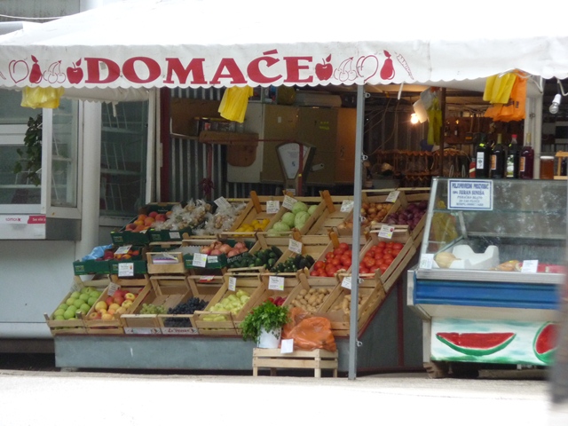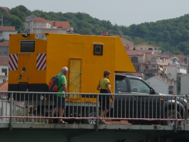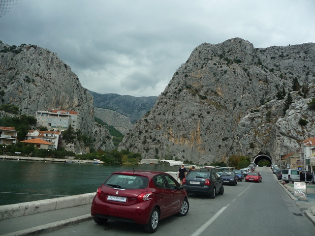 Na sam camping lepiej zjechać z głównej drogi na końcu miejscowości tam gdzie jest znak, gdyż wzdłuż nabrzeża może okazać się miejscami, że dla wysokiego campera są tutaj za nisko gałęzie. Po pożegnaniu z właścicielką jedziemy dalej. Mijamy jakieś portowe miasteczko i wjeżdżamy do Trogiru. Przejeżdżamy wyspę, na której znajduje się starówka i za kolejnym mostem na Ciovo skręcamy w lewo by po 500m przystanąć na nabrzeżu. W mieście trwa normalne życie – wita nas targ, - zwykły codzienny dzień w środku września.