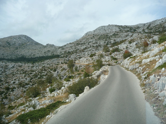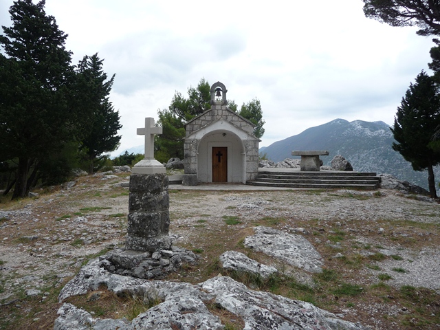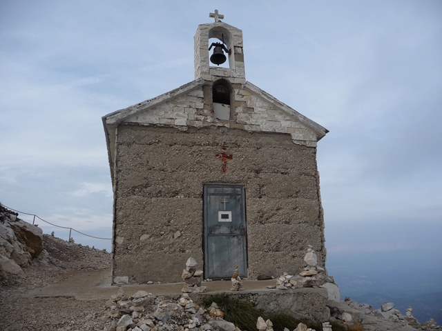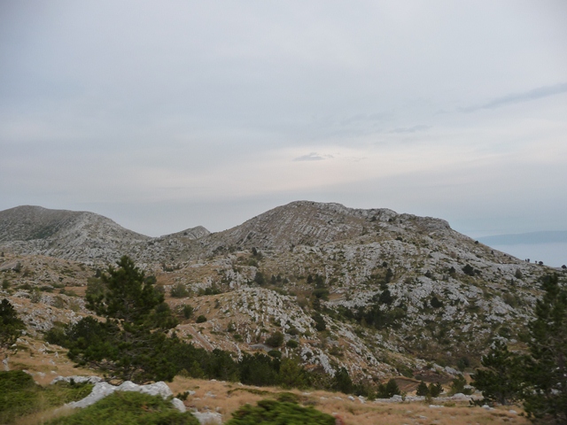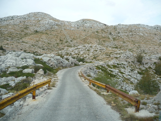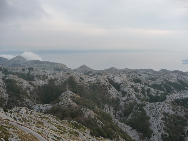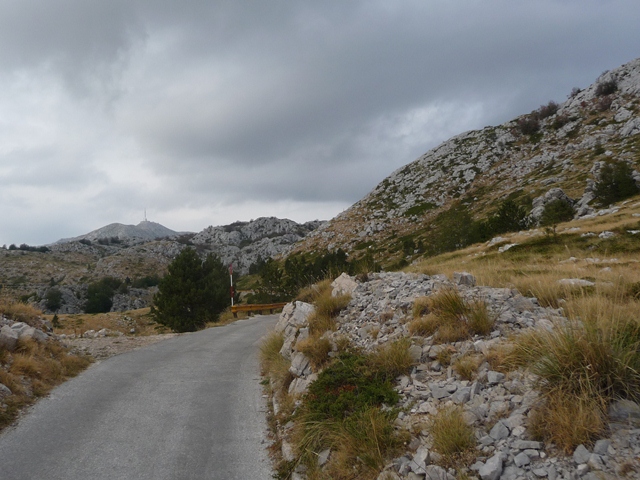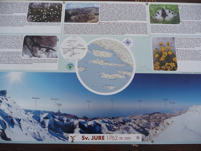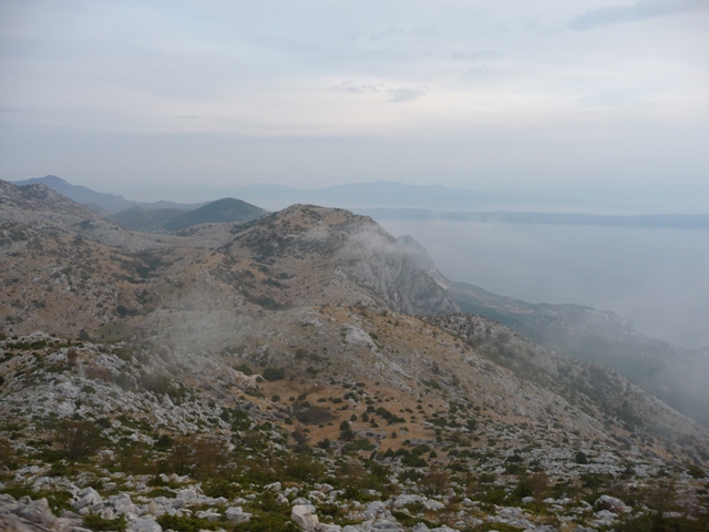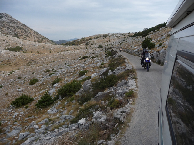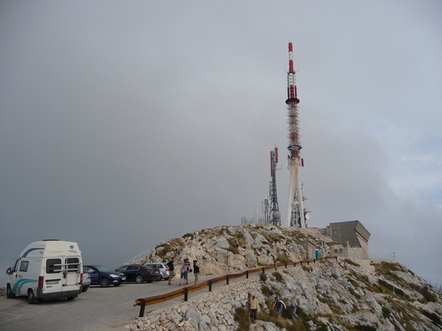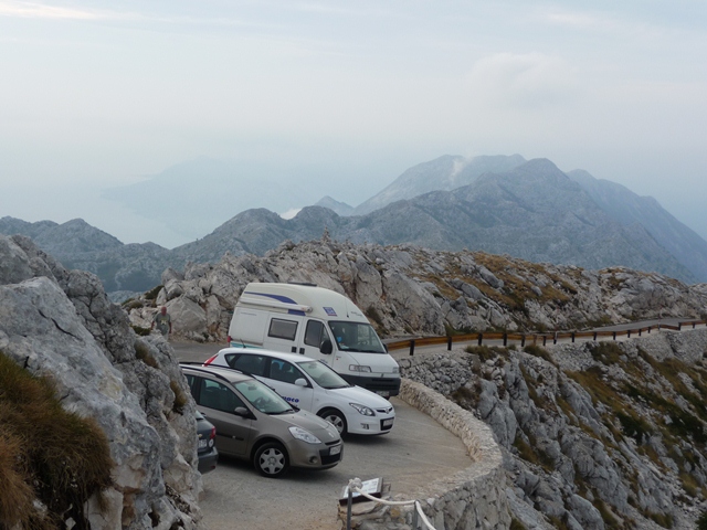 Mamy w końcu możliwość zakosztowania gór z bliska. Po minięciu 1500m pojawiają się przy drodze tyczki z łańcuchami – innych zabezpieczeń brak. W końcu jesteśmy 1750 z hakiem zdobyte to najwyżej położona trasa w Chorwacji. Jest tu niewielki parking na 20 osobówek. Widoki mniam 360 stopni – przy lepszej widoczności miodzio. Na górze jest przekaźnik, a idąc ścieżką dociera się po minucie, dwóch do niewielkiej kapliczki. Na górze oczywiście też tylko prawie same polskie rejestracje. Piękne miejsce szkoda tylko, że nie wolno tu zostać na noc bo ani chwili byśmy się nie zawahali.