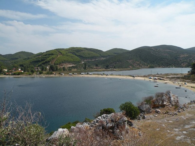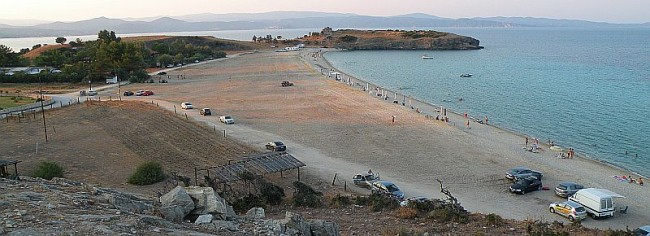 40.250446,23.722612 - plaża Omos Panagias. Można stać po obu stronach plaży. Przy ruinach i po drugiej stronie.