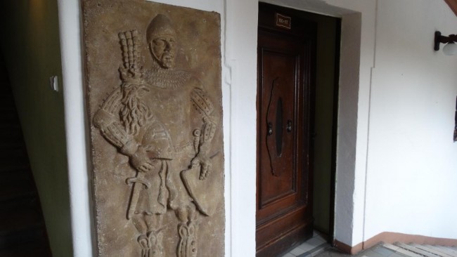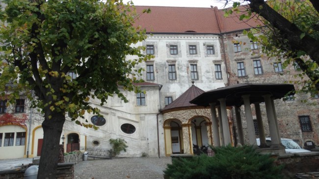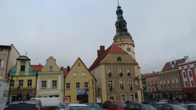 Schodzimy z zamku na rynek, gdzie jest ciekawy ratusz renesansowy z unikalnym w tych okolicach zegarem słonecznym.