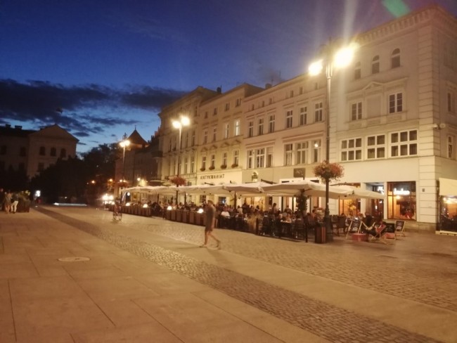 Po zapadnięciu zmroku udajemy się na starówkę pięknym mostem Staromiejskim, na którym przygrywa orkiestra. Spacerujemy po rynku, po czym przystajemy przed jedną z kamienic, bowiem w jej oknie o godzinie 21.13 i tak samo w dzień o 13.13 pojawia się na kilkanaście sekund Jan Twardowski. Wiąże się z nim legenda bydgoska o burmistrzu, którego na własne życzenie Twardowski odmłodził, ale tak, że nikt go nie rozpoznał - nawet własna dużo młodsza żona, dla której to zrobił. Teraz Twardowski pojawia się w oknie z twarzą zasłoniętą maseczką - o czasy! o obyczaje!