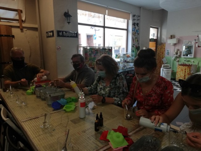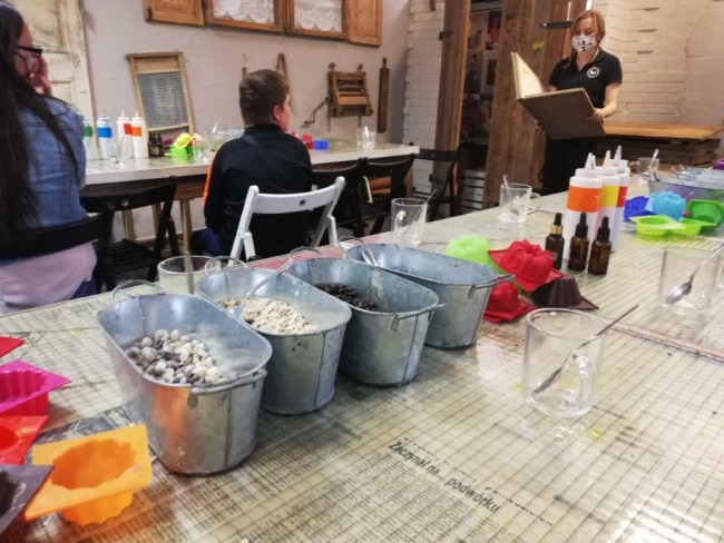 Wizyta w Muzeum oczywiście w obowiązkowych maseczkach, zaczyna się od krótkich warsztatów, w trakcie których zgodnie ze wskazówkami osoby prowadzącej każdy wytwarza własne mydełko wybierając kolor, zapach i kształt. Gotowe mydełko zapakowane w elegancki celofan otrzymujemy na koniec zwiedzania.