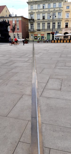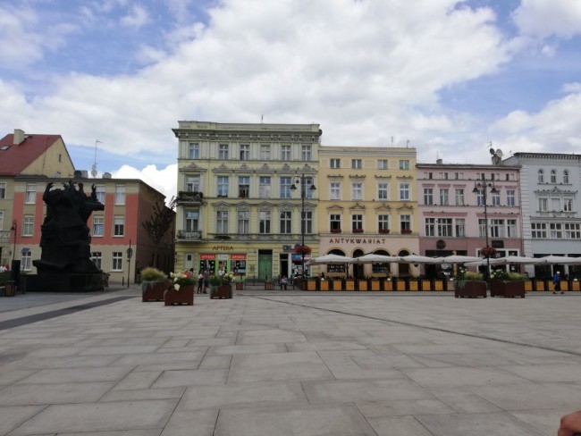 Bydgoszcz ma oczywiście stare miasto z dość dużym rynkiem otoczonym kamienicami i knajpkami z ogródkami. Można by powiedzieć, że to standard, ale przez bydgoski rynku biegnie metalowa szyna, wieczorem podświetlona, wskazując miejsce, gdzie miasto przecina 18 południk. Na końcu szyny stoi zegar pokazujący na jednej tarczy czas aktualny środkowoeuropejski, a na drugiej czas bydgoski zależny od położenia wobec słońca. Dość skromny ratusz stoi z boku, co też nie jest niczym szczególnym, jednakże na środku rynku jest ułożony z ciemniejszej kostki zarys dawnego ratusza, który został zburzony w czasie II wojny światowej. Wreszcie obok zegara stoi pomnik ofiar faszyzmu, taki nie zapadający w pamięć, lecz przyczyna jego postawienia jest nietypowa. Pierwotnie był to pomnik powstania w getcie warszawskim, ale w 1968 roku w którym miał być postawiony w Warszawie nie było mówiąc oględnie sprzyjającego dla niego klimatu, więc postawiono go w Bydgoszczy, gdzie nigdy nie było żydowskiego getta.