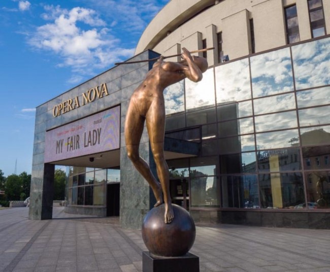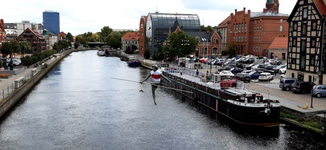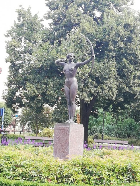 Jednak miasto słynie z innych jeszcze symboli, a są nimi dwa pomniki Łuczniczki – starej i nowej. Stara Łuczniczka celuje z łuku ubrana tylko w sandały stojąc w parku Kochanowskiego. Nowa pręży swe ciało przed budynkiem Opery i nie ma nawet sandałów. Ciągle czeka aż sandały przyniesie jej „Przechodzący przez rzekę” młodzieniec czyli rzeźba zawieszona na linie rozciągniętej nad Brdą. W trakcie naszego pobytu „Przechodzący…” został ubrany w koszulkę z barwami narodowymi Białorusi na znak solidarności z trwającymi już wtedy protestami.