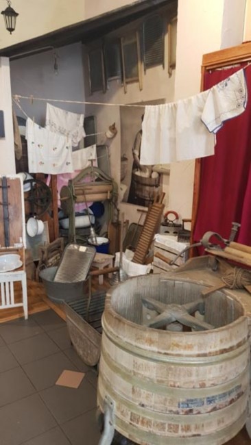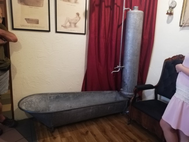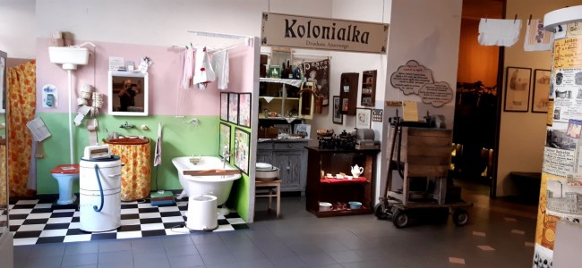 Wędrówkę rozpoczynamy od starożytnych cywilizacji, w których mydło wytwarzano z popiołu i zwierzęcego łoju, a łaźnie służyły również jako miejsca spotkań towarzyskich. Następnie przemierzamy kolejne epoki, gdzie higiena polegała na bardzo rzadkich kąpielach a podstawowymi środkami czystości były perfumy, peruki i grube warstwy pudru - aż do czasów, gdy znowu zaczęto doceniać zalety kąpieli i wymyślano różne coraz lepiej pachnące i wyglądające kosmetyki. Można tu zobaczyć średniowieczną łaźnię, pokój kąpielowy z XIX w., maglownicę, sklep kolonialny. Ekspozycja kończy się na lekko nostalgicznych dla osób z mojego pokolenia czasach PRL-u. Mamy tu wnętrze łazienki z jakiegoś tam „M” z plastikową nakładką na wannę na mydło i gąbki. Do tego górna spłuczka i sznurek z nawleczonymi 10-cioma rolkami papieru toaletowego czyli najbardziej pożądany naszyjnik z czasów kryzysu. Jest też kolekcja suszarek do włosów „z epoki”, w tym stojący kubeł z zakładu fryzjerskiego. Zestawy kosmetyków damskich i męskich na czele z wodą toaletową „Brutal” i perfumami „Być może”. I wreszcie cała gablota mydeł: od mydełka dla dzieci „Jacek i Agatka” przez kostkę o angielskiej nazwie „For you” po niewątpliwy szlagier tamtych czasów „Zielone jabłuszko”.