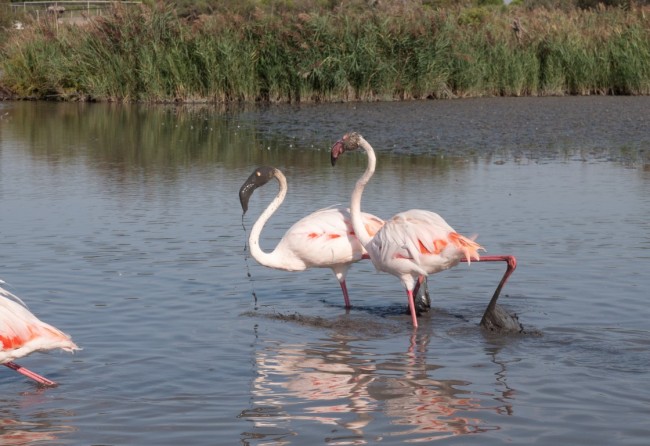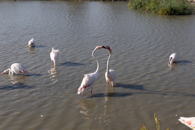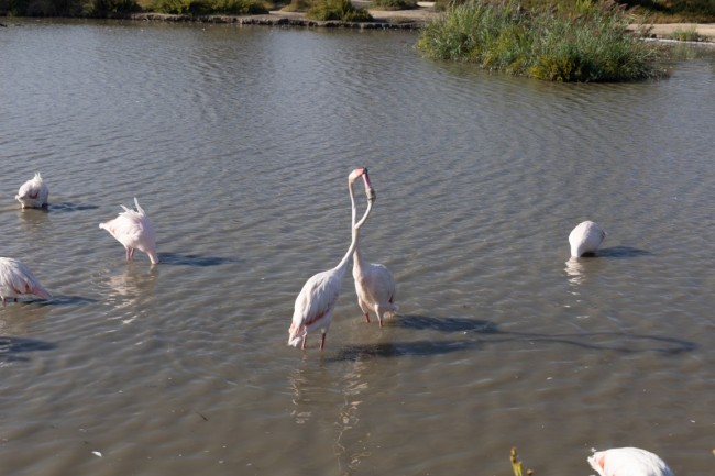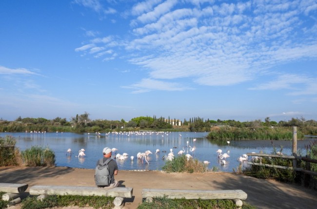 W odróżnieniu od Villars-les-Dombes tu wszystkie ptaki żyją na wolności, bez klatek. Ogromne ilości flamingów, trochę bocianów, czaple różnej maści, kaczki oraz parę innych gatunków ptaków, których nie znam, ale wszystkie są fantastyczne. Naturalne tereny, ścieżki, wieżyczki obserwacyjne, ławeczki do odpoczynku i podziwiania ptaków oraz tablice informacyjne nie tylko po francusku, ale i po angielsku (!). W sumie jesteśmy to około 1,5 godziny robiąc krótszą trasę, niektórzy z kawałkiem trasy dłuższej. Ten raj dla pasjonatów obserwowania ptaków bardzo się nam podoba.