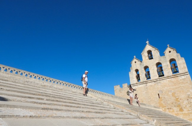 Saintes-Maries-de-la Mer czyli „miasto trzech Marii” oczarowuje dominującą bielą zabudowań oraz siecią wąskich uliczek pełnych sklepików, straganów i knajpek. Głównym zabytkiem jest kościół warowny Notre-Dame-de-la-Mer stojący w miejscu, do którego według legendy 40 lat po narodzinach Jezusa przypłynęły na barce z Jerozolimy trzy Marie. Romańska budowla surowa w swym zewnętrznym i wewnętrznym wizerunku ma dwie dodatkowe atrakcje. Pierwszą jest krypta, w której stoi ubrana w strojne szaty ciemnoskóra Sara, służąca trzech Marii, a teraz patronka Romów. Drugą jest spadzisty kamienny dach kościoła, na który można wejść i zobaczyć panoramę miasta. Oczywiście czynimy to, ale oprócz podziwiania widoków zastanawiamy się jak bezpiecznie zejść ze szczytu stromego dachu. Na szczęście udaje się i możemy ostudzić nasze emocje zimnym piwem z akompaniamentem nienachalnej muzyki. Wracamy na camping promenadą ciągnącą się wzdłuż piaszczystej plaży.