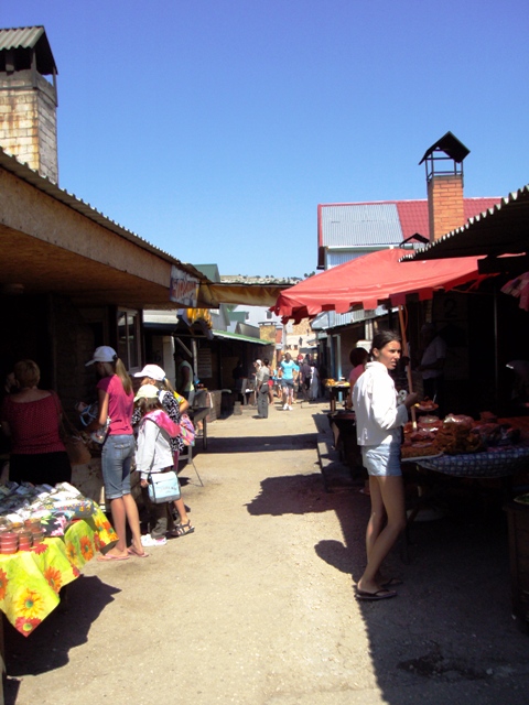 Krym cz2 257.jpg A to miejsce do obdzierania turystów ze skóry. Kilka uliczek restauracji tatarskich. Karmią tam równie smacznie co drogo. Do szaszłyka czy czebureków podają wspaniałe wina, a do tego za kilkanaście hrywien możliwość sfotografowania się z sokołem, wielbł |