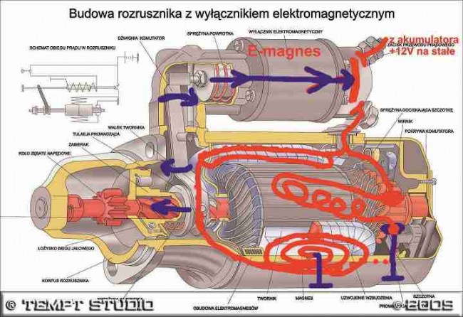 Jednocześnie przesuw rdzenia zatrybia zębatkę bendiksa z kołem zamachowym silnika zgodnie ze strzałakmi. W tym momencie jak bendiks jest wysunięty i zwarte są obie śruby to prąd zaczyna przepływać na stojan i na szczotki wirnika i dalej na masę, tak jak to nabazgrałem na tym rysunku.