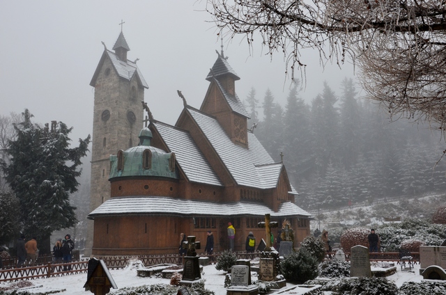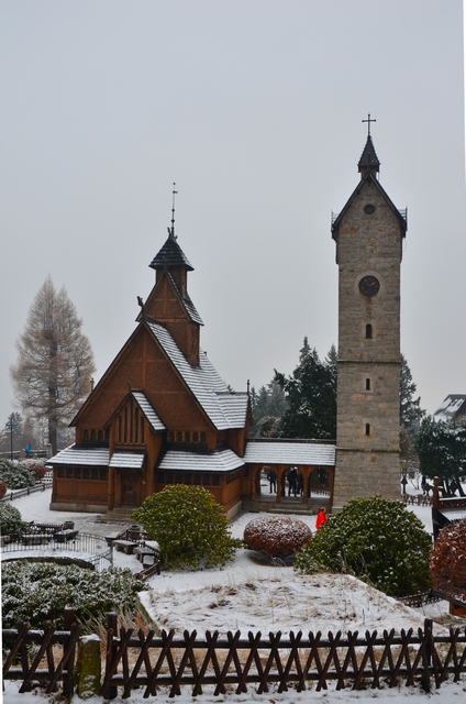 DSC_0245.JPG Wreszcie docieramy do świątyni Wang, zbudowanej na przełomie XII i XIII w. w miejscowości Vang w Norwegii. Wilhelm IV zlecił przeniesienie kościółka najpierw do Berlina, następnie zmienił decyzję i w 1842 r. Ewangelicy z Karpacza mieli swoją świątynię. |