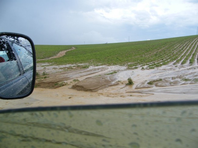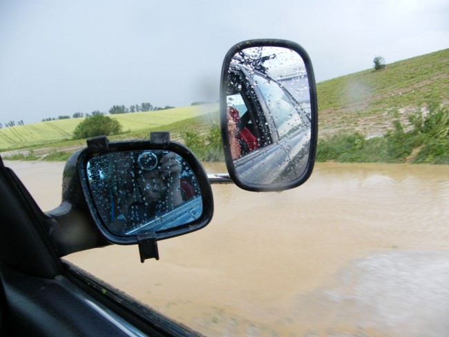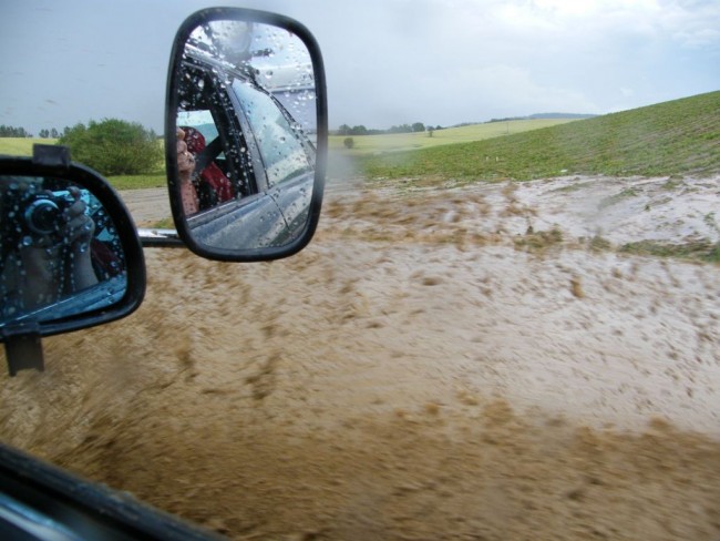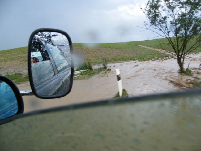Nie miałem złudzeń zbliżalo się małe tornado,postanowilem zatrzymać się poza zabudowaniami w polu gdzie nie było drzew na drodze.Stałem sam bo inni zatrzymali sie w małej miejscowości,którą ja postanowiłem przejechać.Nie wiem czy zrobiłem dobrze.potem rozpętało się piekło.deszcz,grad i silny wiatr,ale zespół trzymał się dzielnie na ziemi.Na krótko nie było nic widać dookoła.Po przejściu wichury długo stałem ale nikt nie jechał ani z tyłu ani z przodu.Mój pilot(zona)wpadł w lekką panikę.przeanalizowałem sytuację i postanowiłem jechać naprzód.Mieliśmy dużo szczęścia,drogę zalało i było nie ciekawie.minęliśmy parę samochodów które zostały na drodze zalane najpewniej przez to że były to benzyniaki.Nasz koń szedł równo mimo że woda sięgała do połowy drzwi samochodu.Ten tragiczny odcinek okolo 2kilometry udało sie przejechać dalej juz było dobrze bo pod górę.Ujechaliśmy jeszcze parę kilometrów i dojechaliśmy do stacji paliw gdzie wszyscy czekali czy ktoś przyjedzie z dołu.Szkoda że mój pilot znowu wpadł w panikę oddając się modlitwie zamiast robić zdjęcia.Wszystko zakończylo się dobrze.a morał jest taki:Cycepą też można:)