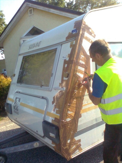 Ruch i jeszcze raz ruch,tak że po siedzeniu parę godz.za sterami wysiłek przy rozkładaniu przyczepy to jest to.Nauczyłem sie też walczyć ze stresem,który zdarza sie mi regularnie co jakiś czas w Słowacji.I znów wracam z południa Europy jest piątek trzynastego maja 2011r.jestem na autostradzie kawałek za Bratysławą w kierunku ukochanej ojczyzny do szczęścia brakuje około 300km,jest duży wiatr,trzy pasy ruchu,jedziemy środkowym 100-110km/godz wyprzedzając sporą ilość TIRów.Duży wiatr plus podmuch przy wyprzedzaniu TIRów powoduje że dość mocno buja "Zaczarowaną dorożką"w pewnym momencie widzę w lewym lusterku lekkie rozszczelnienie na łączeniu czoła przyczepy z bokiem,oczywiście od razu reaguję zjeżdzam na prawy pas kontem oka widzę że rozszczelnienie poiwększyło sie od góry do dołu grozi nam oderwanie całego boku.Cały czas zmniejszam prędkość nie chcę ostro hamować bo jestem między TIRami z przodu widzę samochód serwisowy z taką dużą oświetloną strzałką w lewo stoi na poboczu.Chowam się kilka metrów za nim zakładam kamizelkę szybka ocena i decyzja naprawa główna półgodzinna,zresztą sami oceńcie.Musiałem sie spieszyc sami wiecie jak to jest na autostradzie laweta koszty i zero tłumaczenia.Za półgodziny byłem z powrotem na autostradzie i mkniemy do ojczyzny.Jak sie okazało naprawa okazała sie bardzo skuteczna dzieki taśmie którą widzicie,mieliśmy zapas dwie rolki polecam niezbędna w różnych sytuacjach.Bardzo dziekuję chłopakom z wozu serwisowego z tą oświetloną strzłką mieli odjeżdzać ale jak zobaczyli co się dzieje poczekali do końca usunięcia awarii