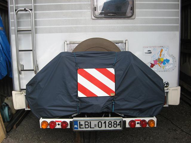 5 minet temu skończyłem pakowanie rowerków na Hiszpanię dokąd śmigamy ze zlotu w Pajęcznie. Wiem, że tablica jest nieprawidłowa, ale bardzo podobna do właściwej na Hiszpanię. Liczę na kurzą ślepotę ichnich stróżów prawa. Właściwa u Duniego byłaby za 10 dni za ok. 50 euro