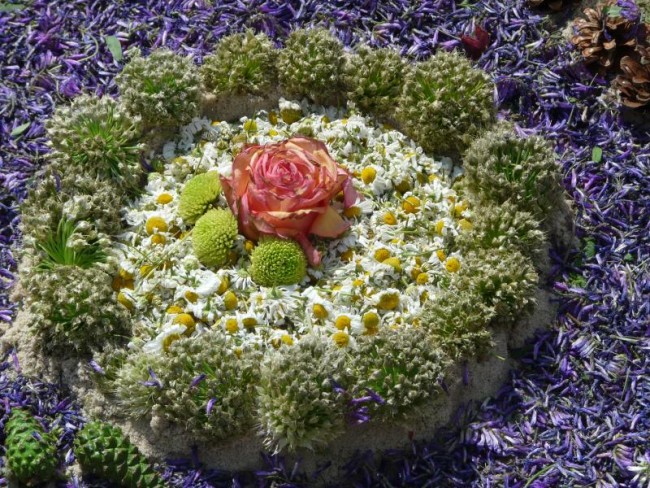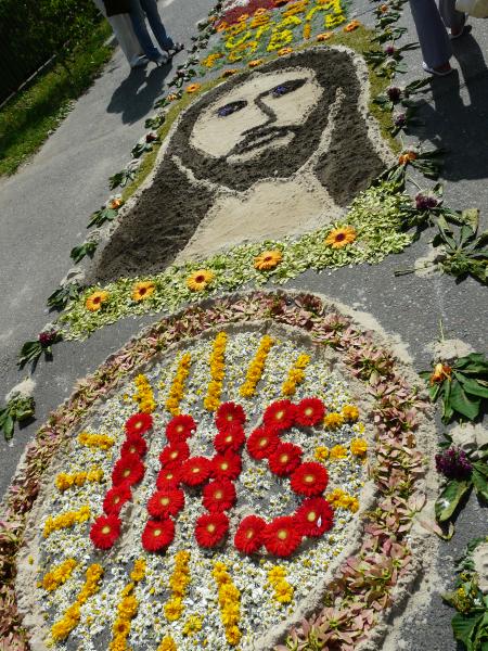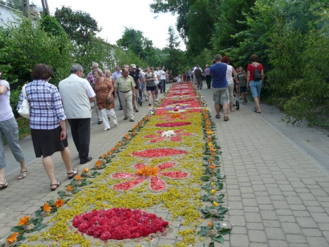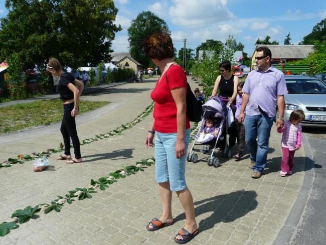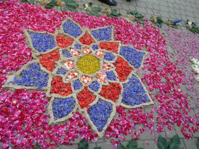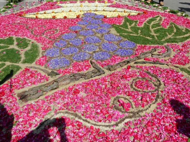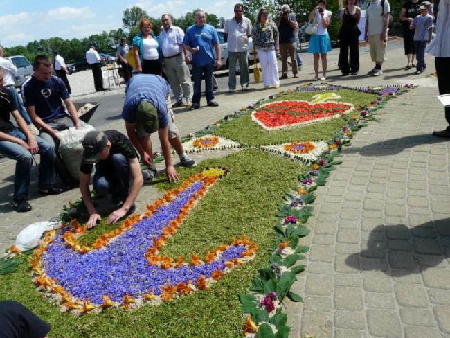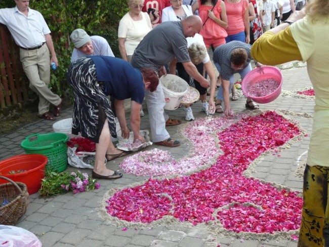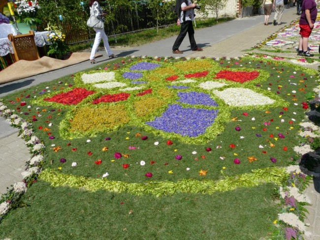 Każda rodzina ma przydzielony swój odcinek chodnika, długość kwiatowych dywanów wynosi ponad 1 km. Cała wieś bierze udział w układaniu, od najmłodszych do najstarszych.