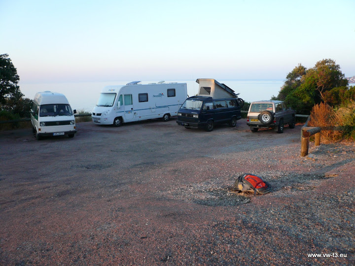 Francja 8/2010 w okolicy miejscowości Agay. Znaleźliśmy tam przytulny parking nad brzegiem morza, spędziliśmy bardzo miły wieczór przy księżycu, tylko ranek okazał się mniej przyjemny. W nocy w czasie naszego snu otworzyli nam zaryglowane drzwi pasażera i ukradli plecak kradnąc z niego ładowarkę do telefonu i aparatu, ale przynajmniej pozostawiając nieopodal mój plecak z paszportami. Ranek spędziliśmy na posterunku policji we Frejus, poznając miłą policjantkę mającą męża Polaka