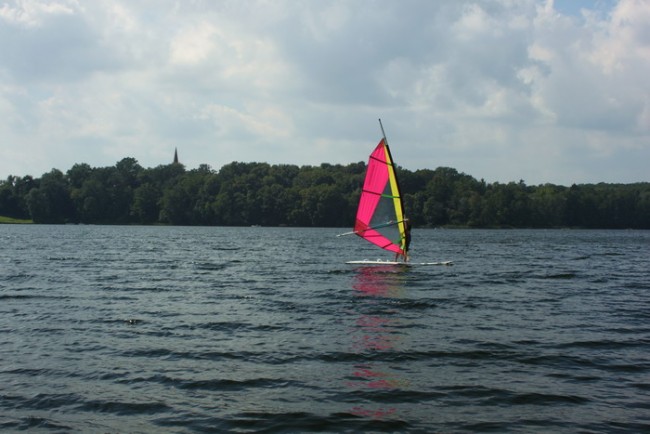 Pogoda była piękna. Na niebieskim niebie powoli i majestatycznie płynęły z zachodu niewielkie, poszarpane chmury. Wiał słaby wiatr, więc fala na jeziorze była niewielka.