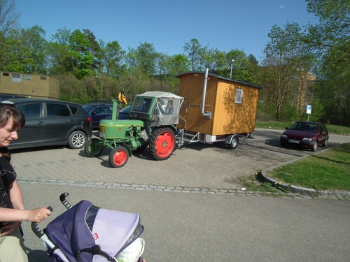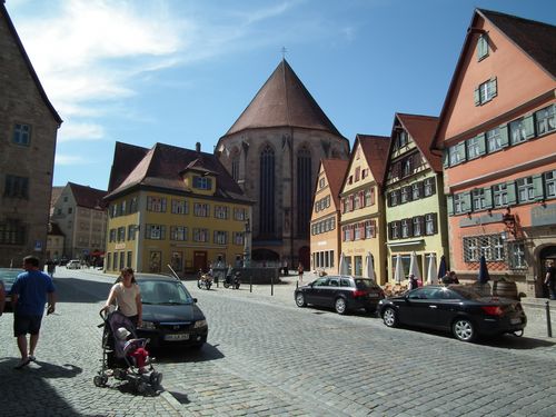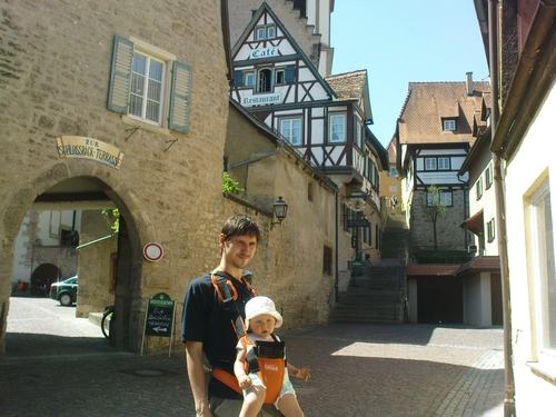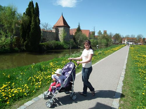 W Dinkelsbuhl - mieście o podobnym do Rothenburga uroku, lecz zdecydowanie mniejszym poziomie wyeksploatowania turystycznego zaparkowaliśmy przy nieczynnym markecie (stellplatz zapchany) i korzystając z wydrukowanego w domu przewodnika ruszyliśmy w miasto. Po obejściu malowniczych uliczek wróciliśmy do kamperka na obiad, po którym ucięliśmy sobie krótką pogawędkę z kierowcą polsko-hiszpańskiego dostawczaka od czterech dni czekającego na ładunek (największym zmartwieniem pana było, iż nie mając dokumentu nie może skorzystać z automatów papierosowych ).