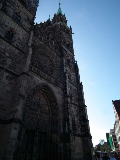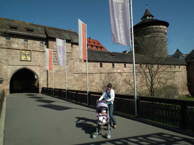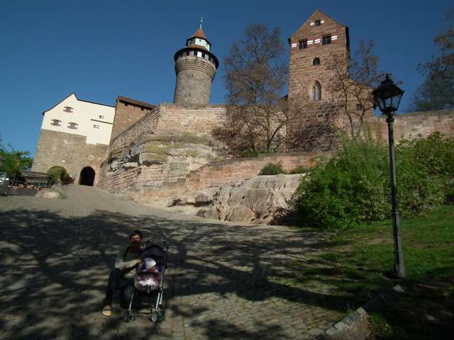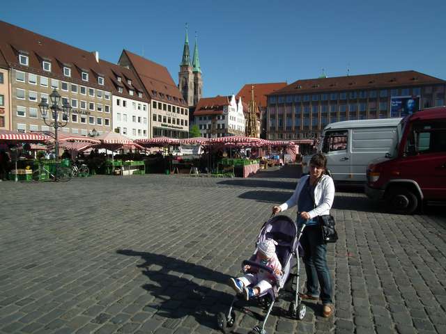 Parkingowe sanitariaty o mało nie stały się przyczyną nieplanowanego prysznica Ali - dziecko i zewnętrzny kran na podczerwień mogą powodować ciekawe sytuacje . W każdym razie dzięki wczesnoporannej pobudce już o 9-tej osiągnęliśmy Norymbergę, w postaci płatnego parkingu w samym centrum miasta w bezpośredniej bliskości placu targowego i Rathausa. Zwiedzanie ograniczyliśmy do linii kompleks zamkowy - dworzec kolejowy. Pomimo oglądnięcia niezbędnego minimum parking i tak kosztował nas 5 EUR. Następnie za pomocą Hołka (choć wyciszonego) trafiliśmy na tereny stadionów nazistowskich (Deutsche Arena), by dumnie zalopotać polską banderą i grunwaldzką flagą i zdeptać niemieckie betony polską stópką Aluni i Bery .