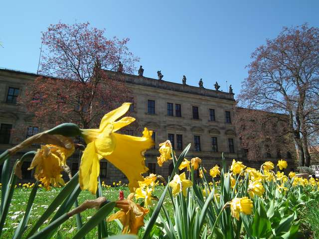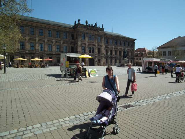 Następny przystanek wytyczyła nam niezdrowa pasja zbierania turistickych znamek (wersja lokalna - tourentaler), a mianowicie numer 417 - pałac w Erlangen. Brak drobnych centów na płatny parking w pobliżu Kauflandu pozwolił na tylko półgodzinną opłatę, co z kolei wymusiło na nas przyspieszenie tempa zwiedzania. Choć i tak przejście główną ulicą Hauptstrasse od starego miasta po nowoczesny ratusz z zahaczeniem o park pałacowy zajęło nam 45 minut poza czas opłacony. Na szczęście obyło się bez przykrych konsekwencji.