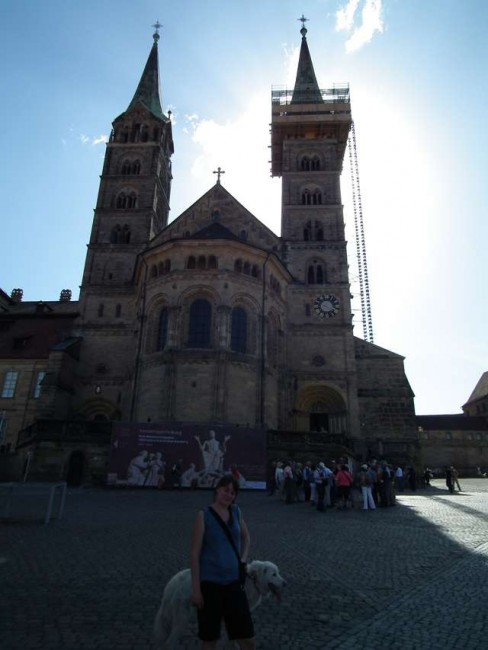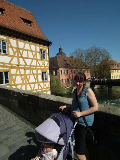 Bez konsekwencji obyło się również przy parkowaniu w kolejnym miejscu na naszej liście do zwiedzania - Bambergu. A to dzięki uczynnemu niemieckiemu mikrokamperowiczowi (chyba - Fiat Doblo, kobieta, dziecko w kabinie rozłożony materac i mały piknik koło samochodu), który na znalezionym wreszcie (po długim poszukiwaniu bez żadnych wskazówek) kawałku parkingu na południowym brzegu rzeki Rednitz poinformował nas łamaną angielszczyzną, językiem migowym i niemieckim, że jest tu ograniczona strefa postoju i "ankunftzeit" wynosi 2 godziny, a on sam co dwie godziny zmienia miejsce postoju . Prowizorycznie stworzona plakietka (kawałek kartki z opisem godziny przyjazdu) uchroniła nas przed znalezieniem za wycieraczką obecnego u innych parkujących liścika mandatowego po powrocie ze zwiedzania. A samo miasteczko bardzo malownicze, choć sobotnie popołudnie w połączeniu z ładną pogodą spowodowały istny wysyp ludzi na deptakach w centrum.