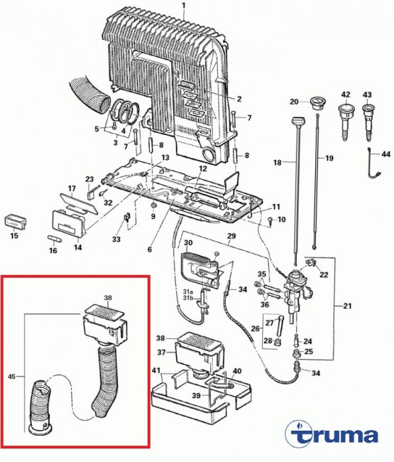 Truma nie siedzi na podlodze plasko i oprucz powietrza na dol idzie jeszcze dolot gazu. Rorka schodzi z 5 cm ponizej podlogi. Przeskoczylem to posadawiajac piec na 10 cio cm cokole z drewna. Piec jesr teraz 10 cm nad podloga , latwiejszy dostep do dolu palnika wszystko szczelnie zamykane a dolot powietrza zrobilem boczny.