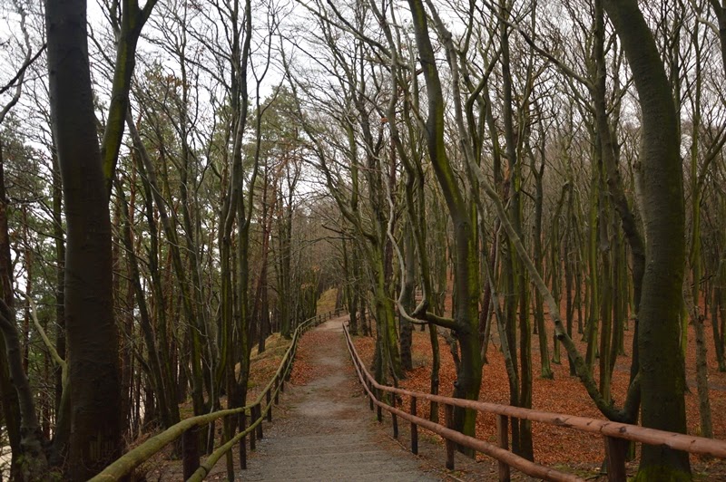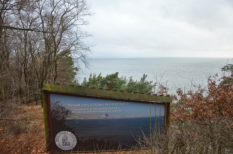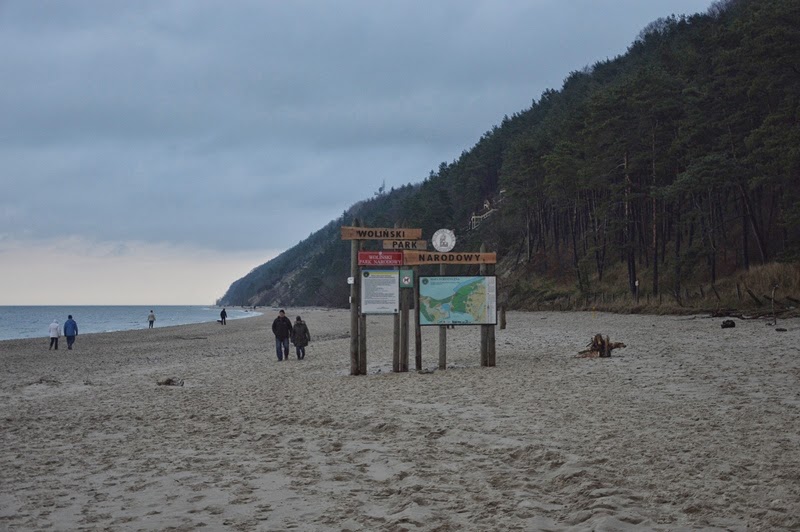 Przed Międzyzdrojami jest zagroda żubrów, Kawcza Góra więc nudzić się nie będziemy. Zagroda dziś niestety zamknięta (w pobliżu jest parking), ale na górę można się wspiąć. Parkujemy zaraz w pierwszej uliczce, gdzieś przy plaży jeszcze przed miastem. Mijamy bramę Wolińskiego Parku Narodowego (od Dziwnowa jesteśmy już na wyspie) i schodami pod górę.